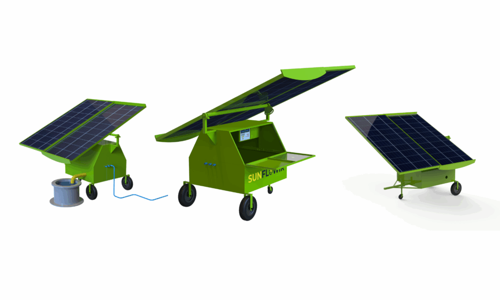 SunflowIR es un carro de riego solar portátil, creado para la Agricultura Familiar Campesina en zonas rurales sin electricidad estable. Su diseño está orientado a predios de 0,5 a 5 hectáreas, ofreciendo una alternativa limpia y autónoma frente al riego por gravedad o motores a combustión.